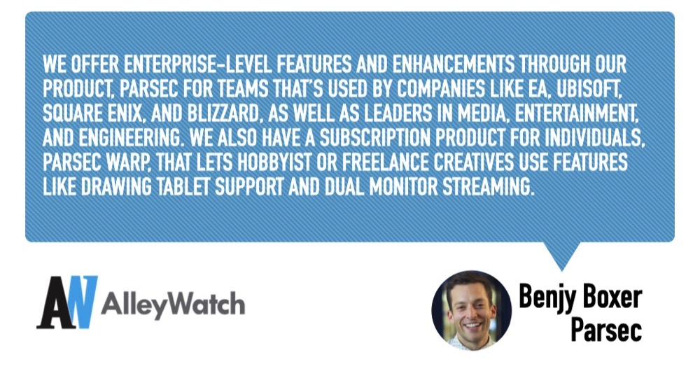 We offer enterprise-level features and enhancements through our product, Parsec for Teams that’s used by companies like EA, Ubisoft, Square Enix, and Blizzard, as well as leaders in media, entertainment, and engineering. We also have a subscription product for individuals, Parsec Warp, that lets hobbyist or freelance creatives use features like drawing tablet support and dual monitor streaming.