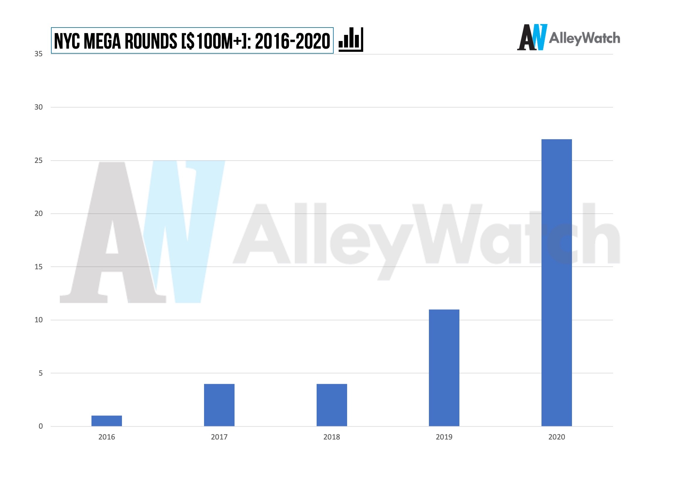 The number of mega-rounds ($100M+) doubled in 2020, representing 34% of all NYC startup funding for the year.