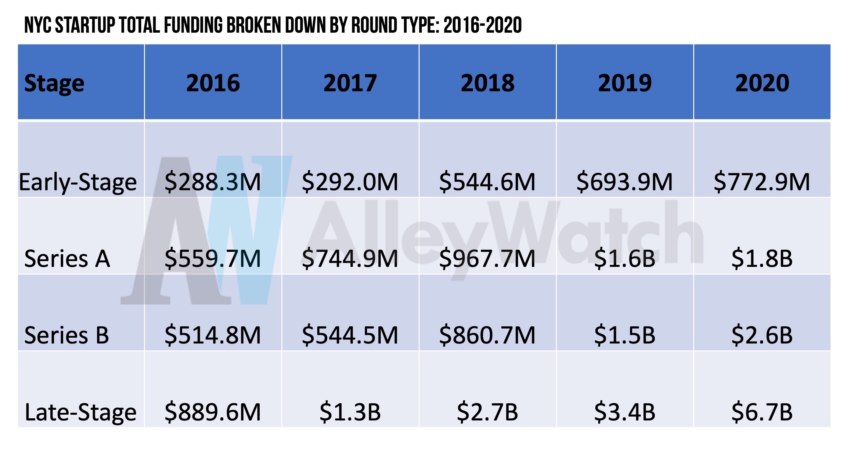 Despite the challenges faced as a result of the pandemic, NYC startup activity was remarkably resilient. By the end of 2020, the venture capital industry deployed $12B in NYC-based startups, the highest total on record, driven by strong Series B and Late Stage (Series C+) activity. 2020 funding figures surpassed the $7.2B mark set in 2019, representing a 67% growth year-over-year. Quarterly funding levels each quarter exceed those of 2019 and funding each quarterly steadily rose in 2020. An unprecedented $4B was raised in Q4.