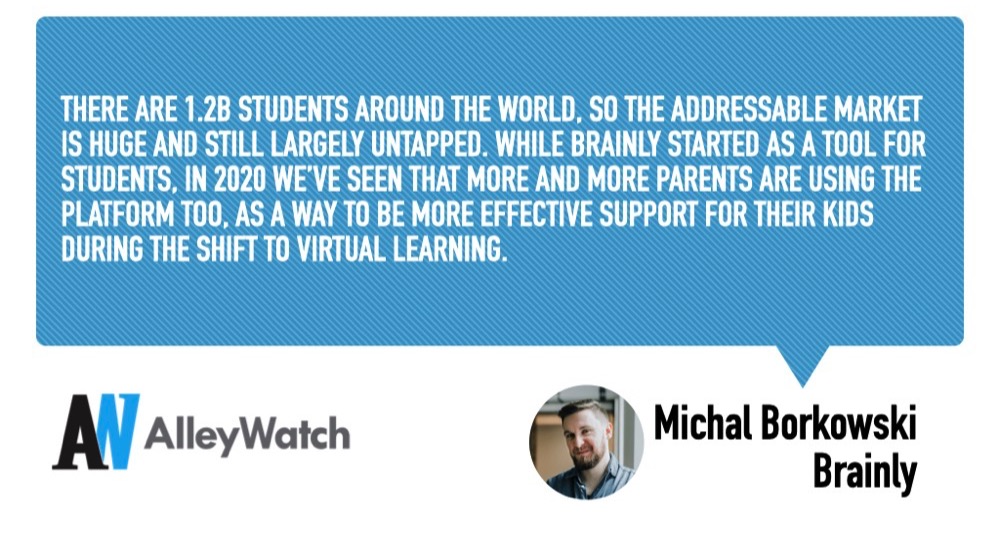 There are 1.2B students around the world, so the addressable market is huge and still largely untapped. While Brainly started as a tool for students, in 2020 we’ve seen that more and more parents are using the platform too, as a way to be more effective support for their kids during the shift to virtual learning. Even before the rise of remote learning, Grandview Research expected the smart education market to grow at a compound annual growth rate of 17.9% from 2020 to 2027. At Brainly we’ve seen growth of 75% since the beginning of 2020.