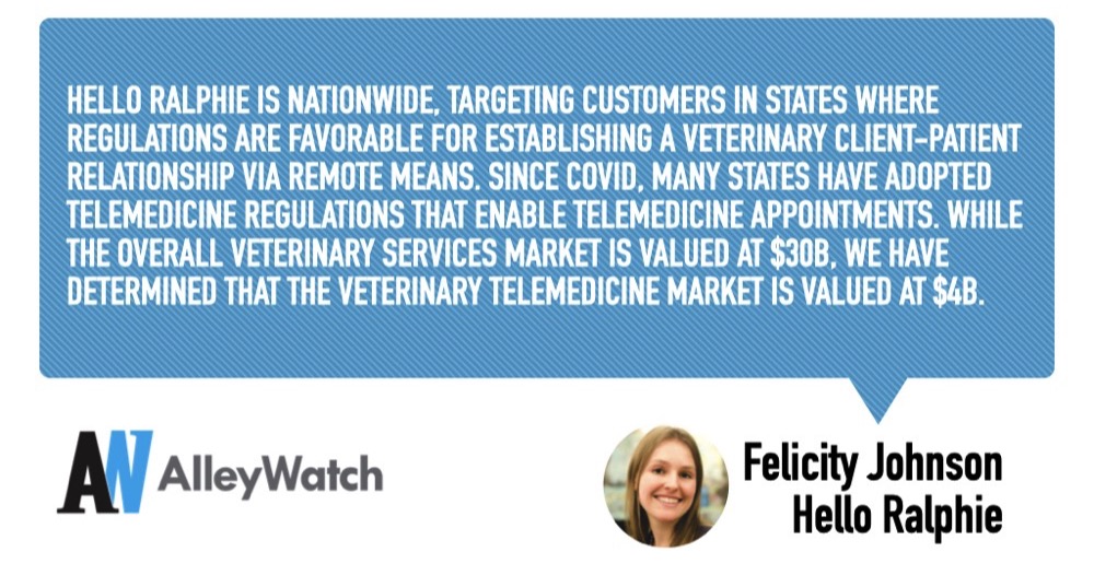 The pandemic has increased the adoption of telehealth services and this is no different for pets. Hello Ralphie is a marketplace that connects pet owners with vetted professionals that provide veterinary telehealth services. Founded by a former developer at Rent the Runway, who enrolled at Wharton to build the platform, Hello Ralphie offers immediate appointments with veterinary technicians to diagnose appropriate treatment options and address any emergencies. The company has experienced a whopping 800% increase in users since March and its service is available nationwide. AlleyWatch caught up with Founder and CEO Felicity Johnson to learn more about the inspiration for Hello Ralphie, the company’s impressive traction, and recent funding round from HearstLab and WPMC Fund.