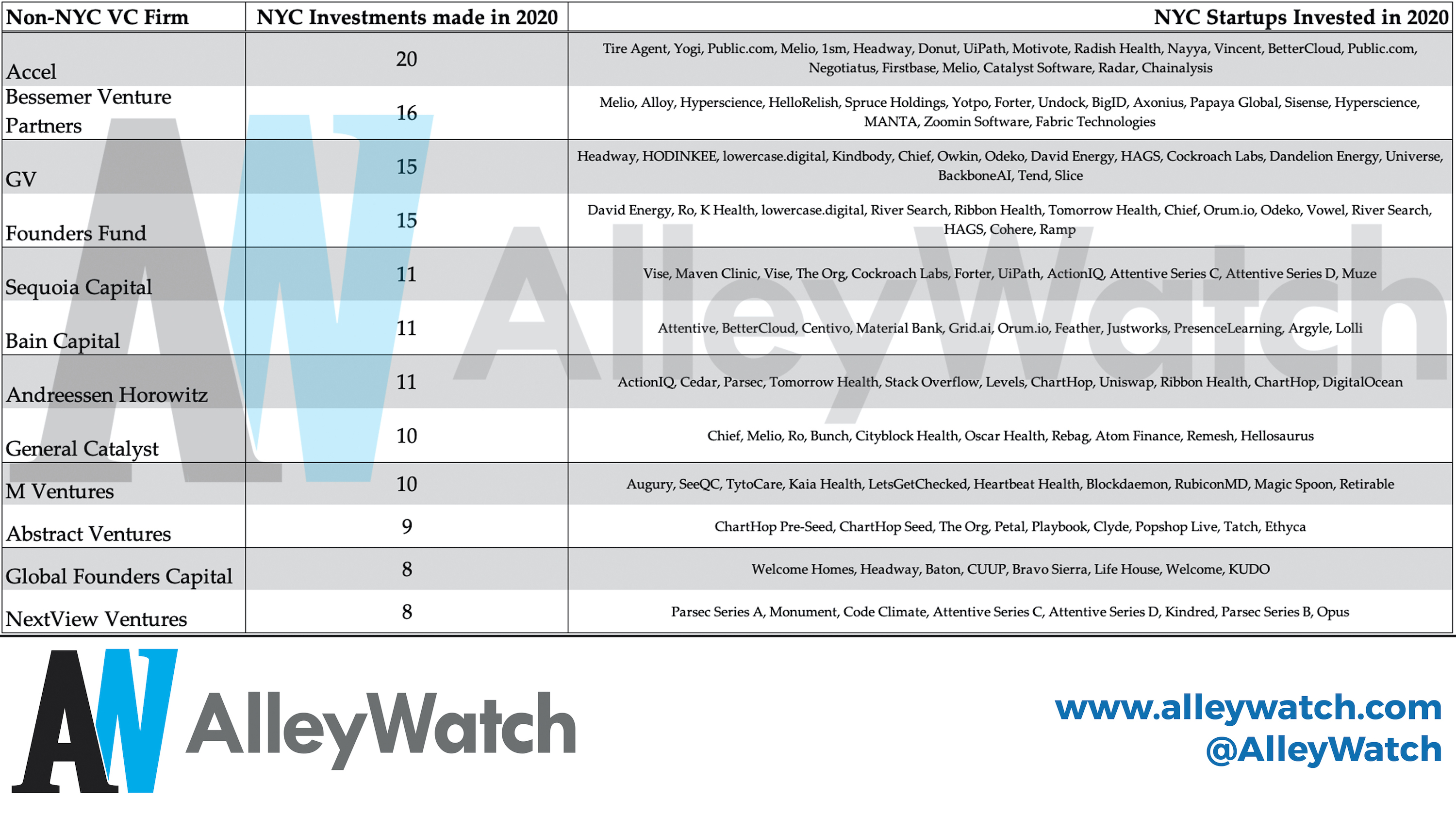- Only venture firms that do not have their headquarters in NYC were considered; some of these firms may have local offices in the city.