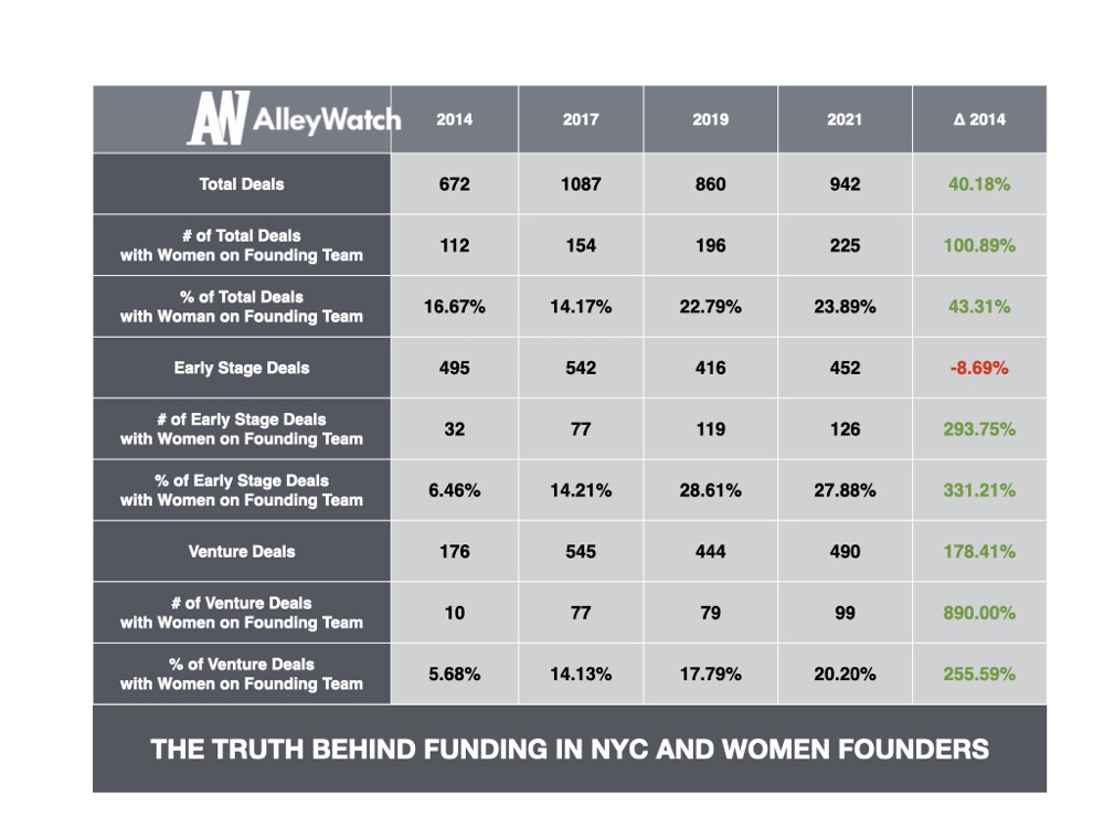27.9 % of all early-stage fundings in NYC had a female founder on the team up from only 6.46% in 2014 Tweet This