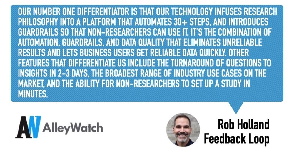 Market research provides a deeper understanding of customers and competitors but setting up research studies has traditionally been a cumbersome process. Ensuring that you have the proper range and scope, are sampling a representative population, and asking the right questions are common potential hurdles that take time to properly account for. This NYC startup makes it easier. Feedback Loop is an agile research platform that allows companies to rapidly and efficiently secure the data and information that they need through automation to identify new business opportunities, execute on go-to-market plans, learn more about their customers, and gather insight into where they are and are not succeeding. The technology-driven SaaS platform also empowers product and marketing teams to gather consumer feedback quickly without having to rely on a separate research team and without sacrificing the integrity of the data collected. Feedback Loop has focused on consumer healthcare, finance, insurance, and CPG verticals with companies like Northwestern Mutual, Humana, Swiss Re, Lending Tree, and the Ad Council as customers.