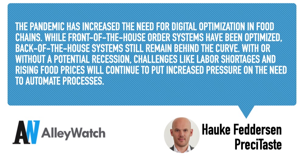 The pandemic ushered in a new area for technology use within restaurants with the first iteration focused on contactless payments and digital ordering. The next wave of technology companies is focused on improving the restaurant industry operationally. PreciTaste is an AI vision platform that’s focused on optimizing the food service in quick-service restaurants and fast-casual restaurants. The company improves the customer experience by increasing the efficiency of restaurants all while cutting down on waste. Using a number of cameras positioned in and outside establishments, the company’s machine learning software is able to provide predictive assessment for demand-based forecasting, order forecasts, and inventory management. Insights are available on a cloud-based dashboard to allow operators to manage several locations as well as the ordering experience. By integrating on-site data layered with external data like traffic and weather, PreciTaste can provide demand forecasts that are 95% accurate for up to two weeks in advance. Customers using the solution have been able to successfully increase EBITDA by 100% by accurately ordering, staffing, and reducing food waste. AlleyWatch caught up with PreciTaste VP of Operations Hauke Feddersen to learn more about the business, the company’s strategic plans, latest round of funding, and much, much more… Who were your investors and how much did you raise? PreciTaste’s $24M Series A is led by existing investor Melitas Ventures, a fund that invests in innovative early-stage food and beverage companies, and Cleveland Avenue, a mission-driven investor in food, beverage, and technology companies. Additional investors include Enlightened Hospitality Investments (EHI), the growth equity fund cofounded by Danny Meyer, the Founder of Union Square Hospitality Group and Shake Shack, and Monogram Capital Partners, a leading consumer-focused growth fund with investments including Chewy.com, Oatly, and Foxtrot. Tell us about the product or service that PreciTaste offers. PreciTaste is a Vision AI platform for operational optimization in foodservice applications like quick-service restaurants (QSR) and retail food preparation. Developed to maximize efficiency, enhance customer experience, and reduce food waste, PreciTaste’s mission is to become the standard for digital food AI management in fast casual and QSR kitchens.