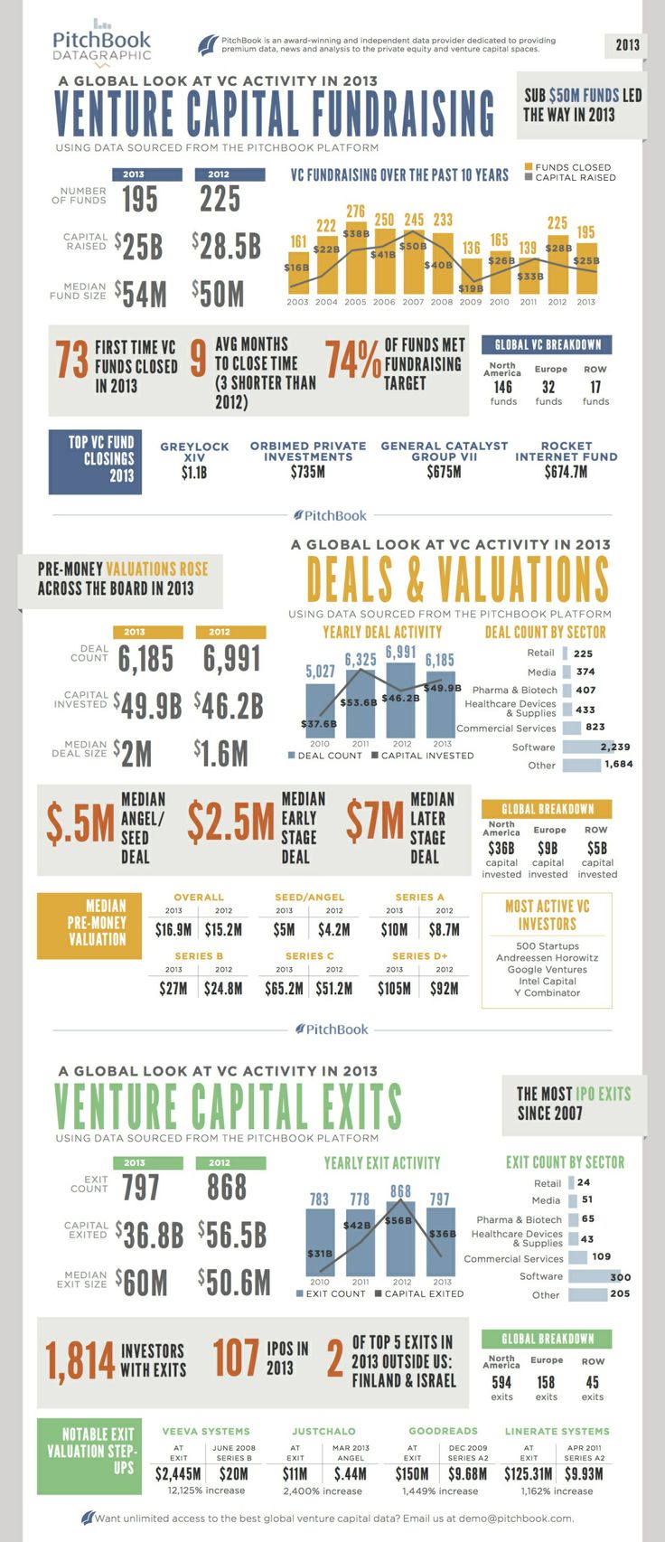 In PitchBook’s recent datagraphic, they take a look at global venture capital activity in 2013, including fundraising, deals/valuations and exits.