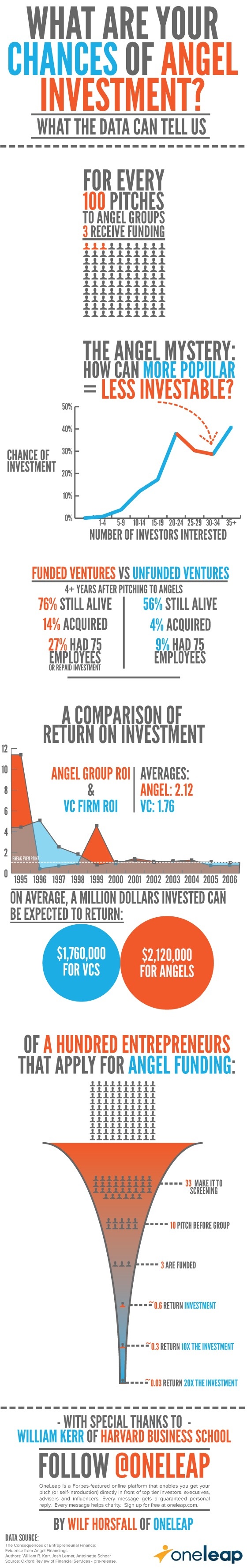 Just what exactly are the chances of your startup getting noticed, and more importantly, receiving funding from an angel investor? OneLeap has put together this infographic to help visualize what the chances are. The news might not be the best, as there might only be a passable chance at being considered for funding. The truth is, the vast majority of those who apply will not end up being on the receiving end of funding.