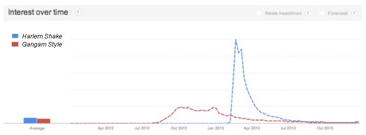 Both of these effects help to drive traffic, but the key is building a positive feedback loop: messages that beget themselves. Seeding the story is not enough; once a topic is trending or close to trending others need to share it organically. Maker’s Studios started “Harlem Shake,”and it was interesting enough to spread to IAC’s properties, corporations, and viral engines like Gawker and Buzzfeed that were able to perpetrate the viral loop. With enough impressions, “Harlem Shake” rose above all of the regular noise (the Buzz Barrier). This prominence, coupled with the recent desire (from the Super Bowl) to be quick and real time, resulted in the Roadblock Effect: