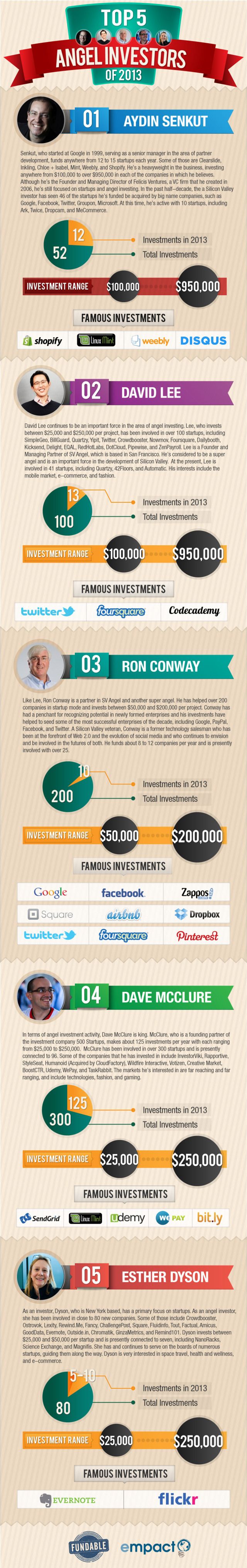 The new infographic from Fundable and Empact shows us the faces behind the top 5 angel investors of 2013. Aydin Senkut, a senior manager at Google, funds about 12 to 15 startups a year; some of his more famous investments include Shopify and Disqus. David Lee, founder and managing partner of SV Angel, has been involved in over 100 startups, including Twitter and Foursquare. Ron Conway, also a partner of SV Angel, has helped over 200 companies in startup mode with a talent for recognizing potential; some of these well-known companies include Facebook, Google, Twitter, Pinterest and Zappos. Dave McClure, a founding partner of 500 Startups, makes about 125 investments per year; some notable companies include Bitly and WePay. And finally, Esther Dyson is a New York based investor who has been involved in close to 80 new companies, including Evernote and Flickr.