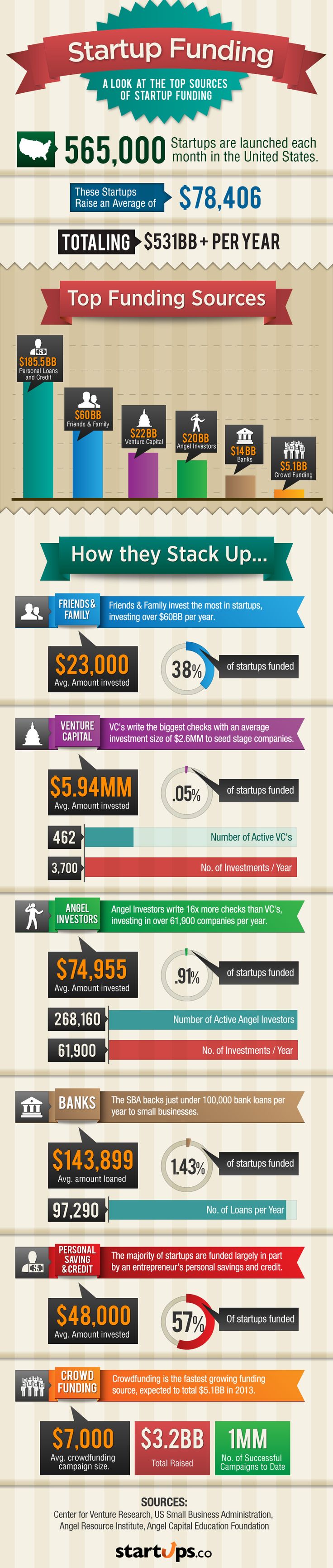 Startups.co’s latest infographic presents the top sources of funding for startups today, some of which may surprise you. For example, the overwhelming majority of funding comes from the entrepreneurs’ personal savings and credit themselves – a whopping 57%! Read more here to see how much funding you can expect to receive from banks, investors and personal contacts, as well as from crowdfunding, currently the fasting-growing source of funding!