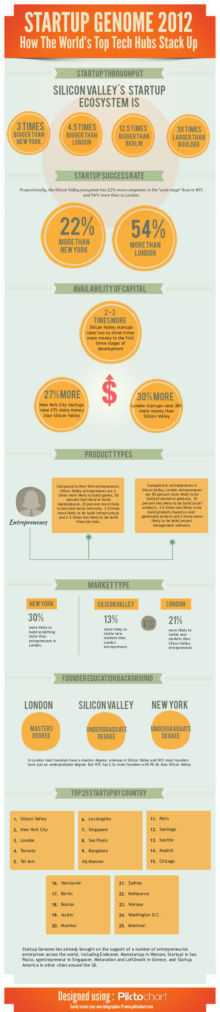 Startup Genome is breaking down the success of startups in Silicon Valley and beyond. Startups based in Silicon Valley are 22% more ‘successful’ than the ones in New York, and 54% more than startups in London. This may be due to the fact that Silicon Valley startups raise 2-3 times more money in the first stages of development than anywhere else. Or that there are three times as many startups In Silicon Valley as opposed to New York, and 4.5 times as many as there are in London.