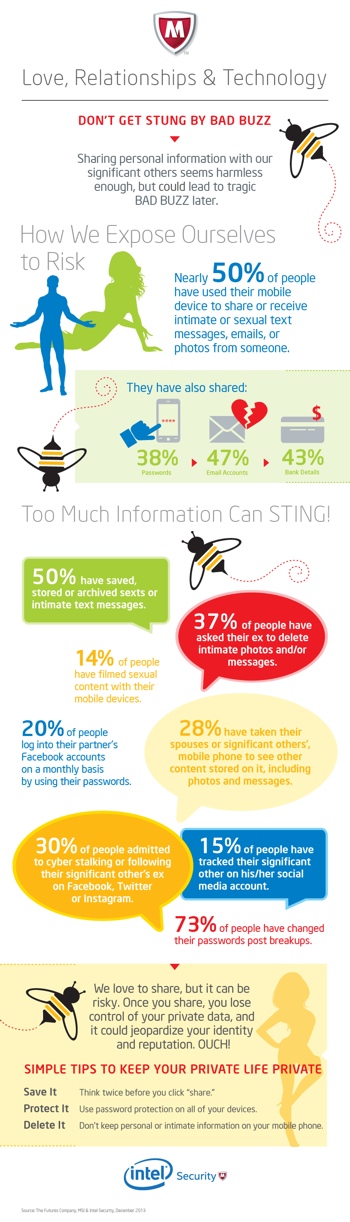 “With all the stories we’ve heard about intimate photos being leaked, it’s hard to believe people are still sharing their passwords,” said McAfee VP Gary Davis. “Ultimately, they’re increasing the risks of these photos becoming public and possibly jeopardizing their identity and reputation. Consumers must take precautions and use mobile security to ensure that what should be private stays private.”
