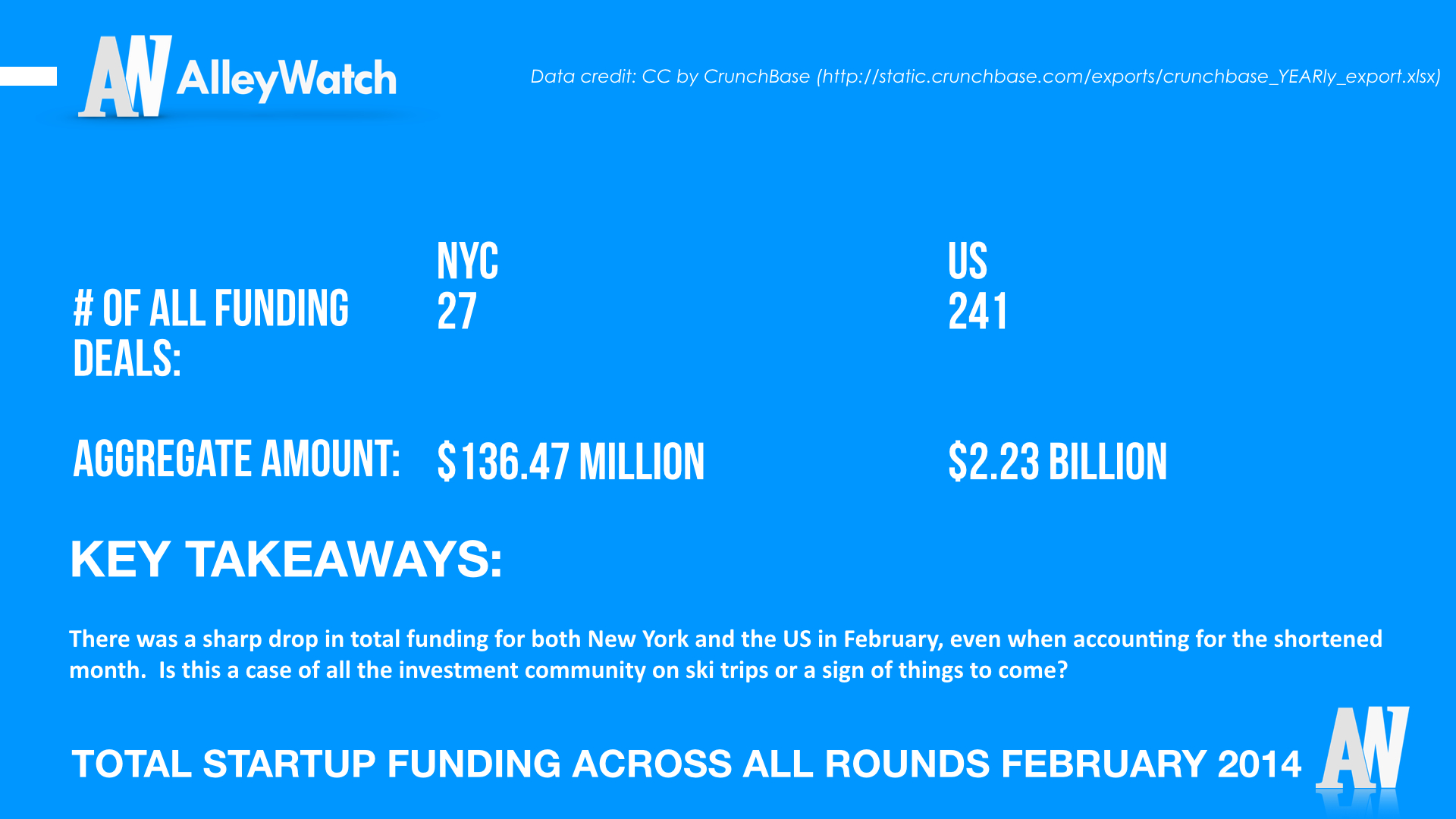 There was a sharp drop in total funding for both New York and the US in February, even when accounting for the shortened month. Is this a case of all the investment community on ski trips or a sign of things to come?