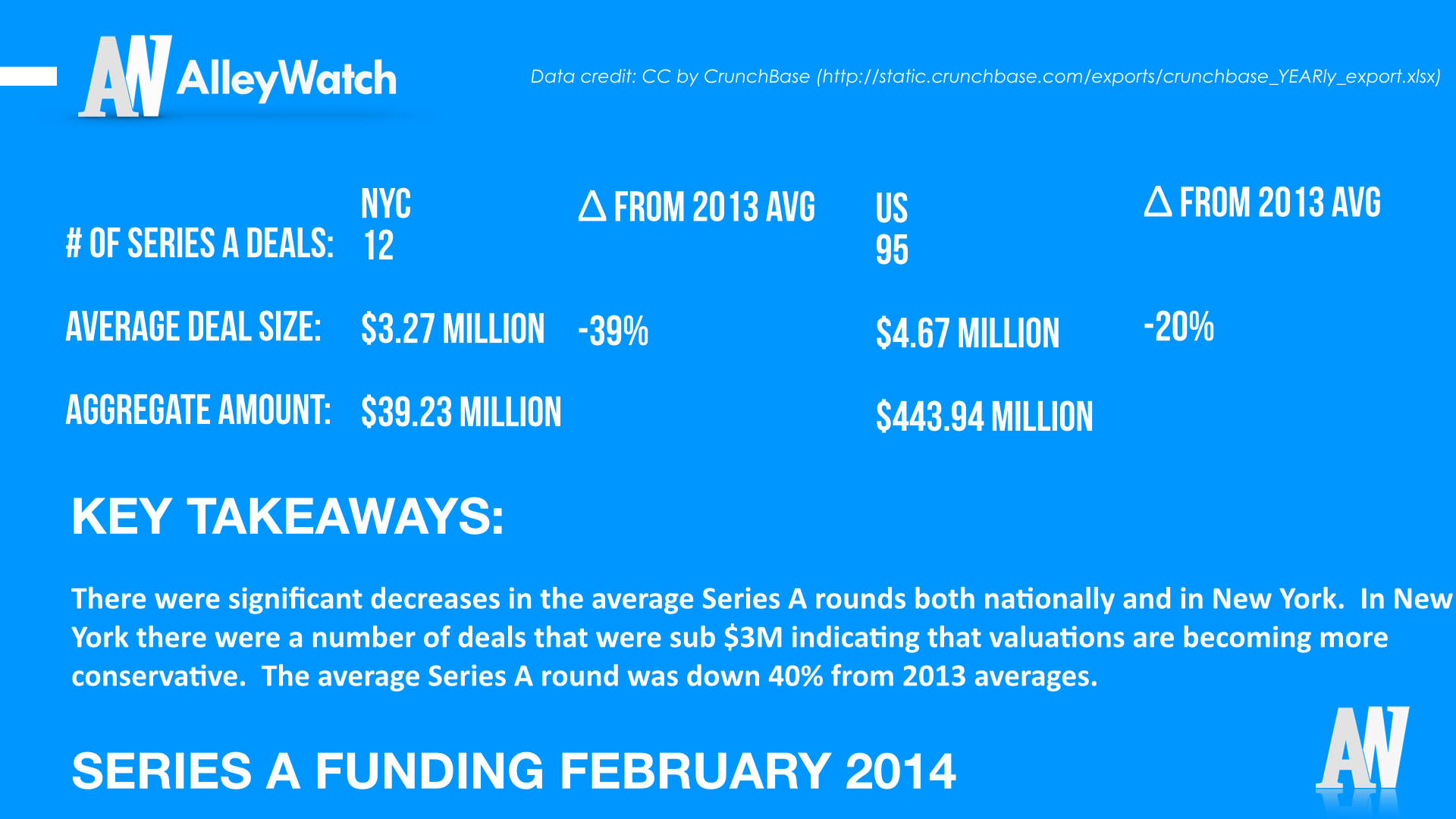 There were significant decreases in the average Series A rounds both nationally and in New York. In New York, there were a number of deals that were sub $3M indicating that valuations are becoming more conservative.
