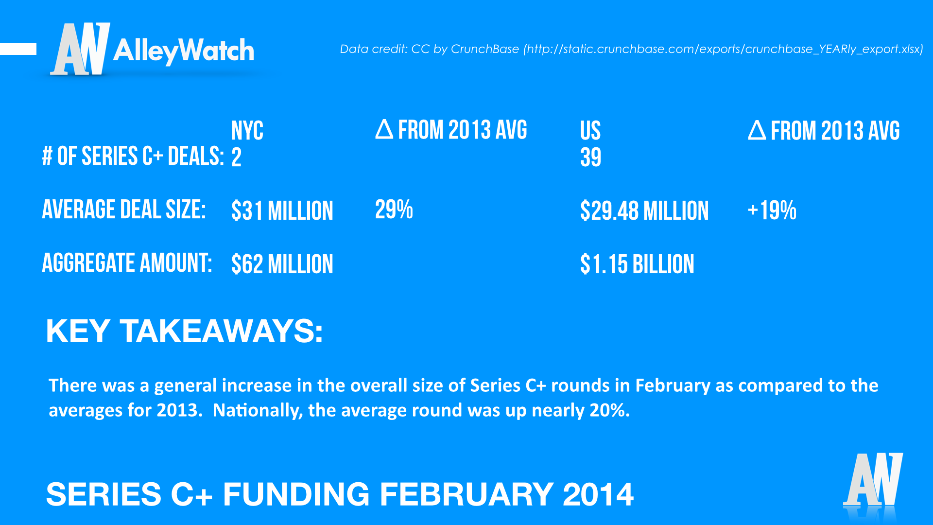 There was a general increase in the overall size of Series C+ rounds in February as compared to the averages for 2013. Nationally, the average round was up nearly 20%.