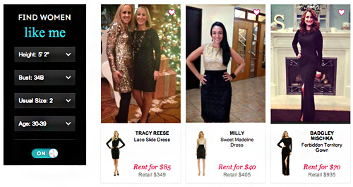 Rent The Runway’s customers can optionally submit photos of themselves in their rentals so other members can find “people like me,” filtered by height, dress size and age group. The products are shown in context with a direct link to the dress’ product page.
