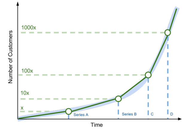 Here the growth path is broken into four stages: Series A, B, C and D. These might correspond to your funding rounds or they might just be milestones that you set for your company. At each stage, you have acquired 10 times the customers that you had at the previous stage. While these are still aggressive goals, they are goals that you can achieve.
