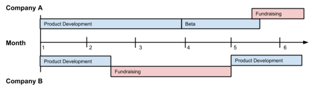 As you can see, after the first six months Company A is already in their Beta and has started fundraising, while Company B is still working on their product because they took three months out for fundraising. This is being conservative, since it’s quite likely that fundraising takes Company B more than 3 months.