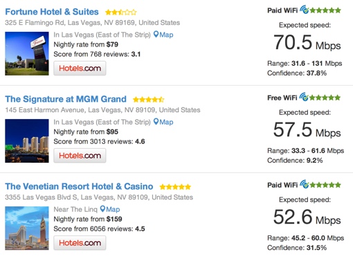 Hotelwifitest.com site offers a wealth of information about each hotel it has speed data for, so you can compare WiFi speeds against room prices and star ratings from guests. It will also tell you whether a connection is free, or whether the hotel will add a fee to your bill to let you use it. You can even book a room through the site (via Hotels.com) if you find a property with the perfect balance. Hotelwifitest.com’s comparison of Las Vegas hotels perfectly illustrates how useful the service is. Book a room at The Venetian and you’ll experience killer speeds averaging 52.6 Mbps. But west of the strip at the Rio, speeds top out at 1.3 Mbps, an incredibly slow connection that will make checking in to the office and getting work done a challenge.