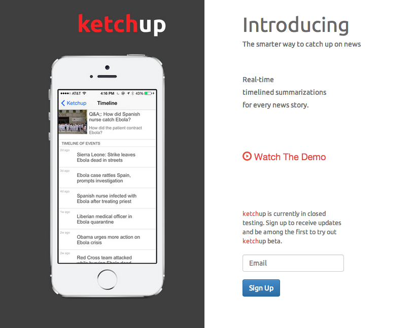 Ketchup in this case is not the condiment but rather a special sauce: it’s a mobile newsreader that creates a timeline of events to accompany news articles, so readers get the whole story. Users are provided historical context of a story to help create a deeper understanding of how events have developed over time, not just what happened last night. It’s ‘ketchup’ as in ‘catch up on news.’