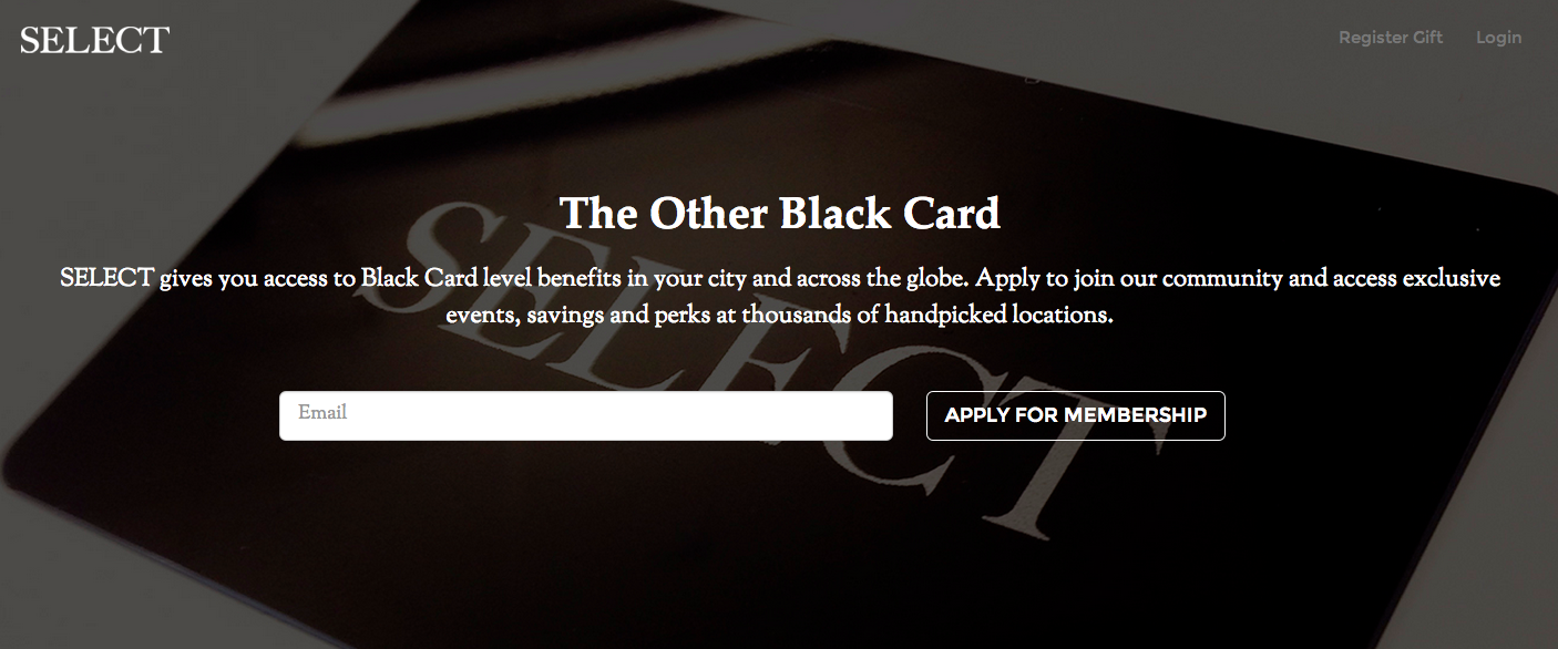 SELECT is a members-only “black card” for the next generation, that provides access to exclusive events, savings, and perks at thousands of locations across the globe directly through the SELECT card. The SELECT community enjoys insider-only rates, access and VIP treatment at premier restaurants, hotels, nightlife venues, retailers, events and more. Think of it as a combination daily deals and credit card done right.