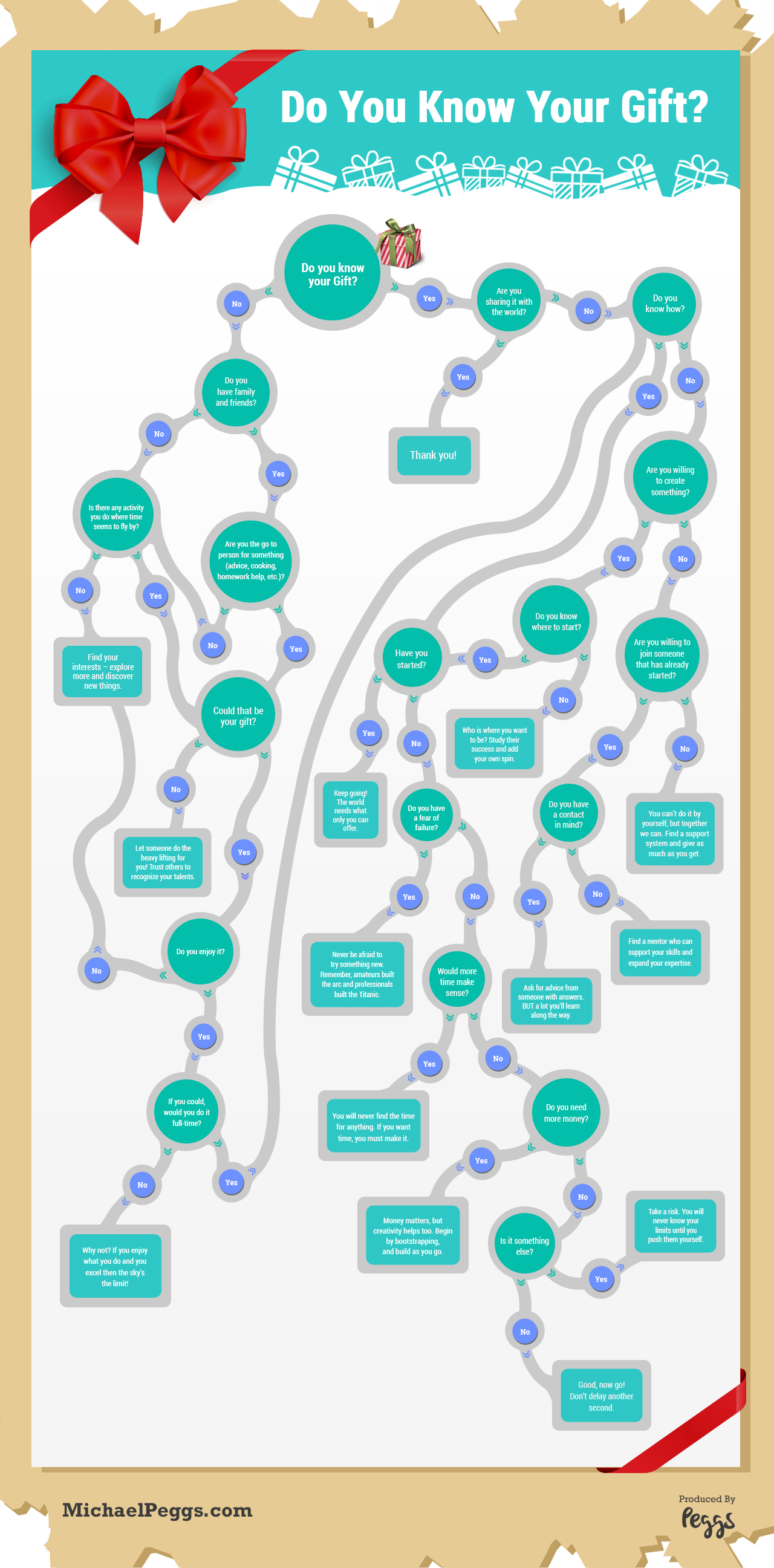 When something works, wash and repeat. It will take time to figure out the perfect plan. Plan, but act in the present. According to Malcolm Gladwell’s Outliers it takes 10,000 hours of practice to be at your best. Spend that time wisely. The only way to reach your highest potential is to grow — better you do so with your gift in mind then to present an incomplete package.