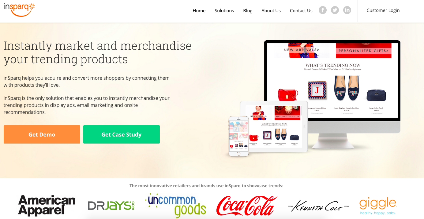 inSparq helps retailers instantly market and merchandise their trending products. Trends drive higher conversion and average order value by showcasing what’s hot at the moment. inSparq is the only solution that enables retailers to merchandise trending products in on-site recommendations, email marketing and now, advertisements. inSparq also offers on-site social tools, allowing retailers to incentivize their shoppers to share more. Clients include innovative retailers like Kenneth Cole, American Apparel and Coca-Cola.