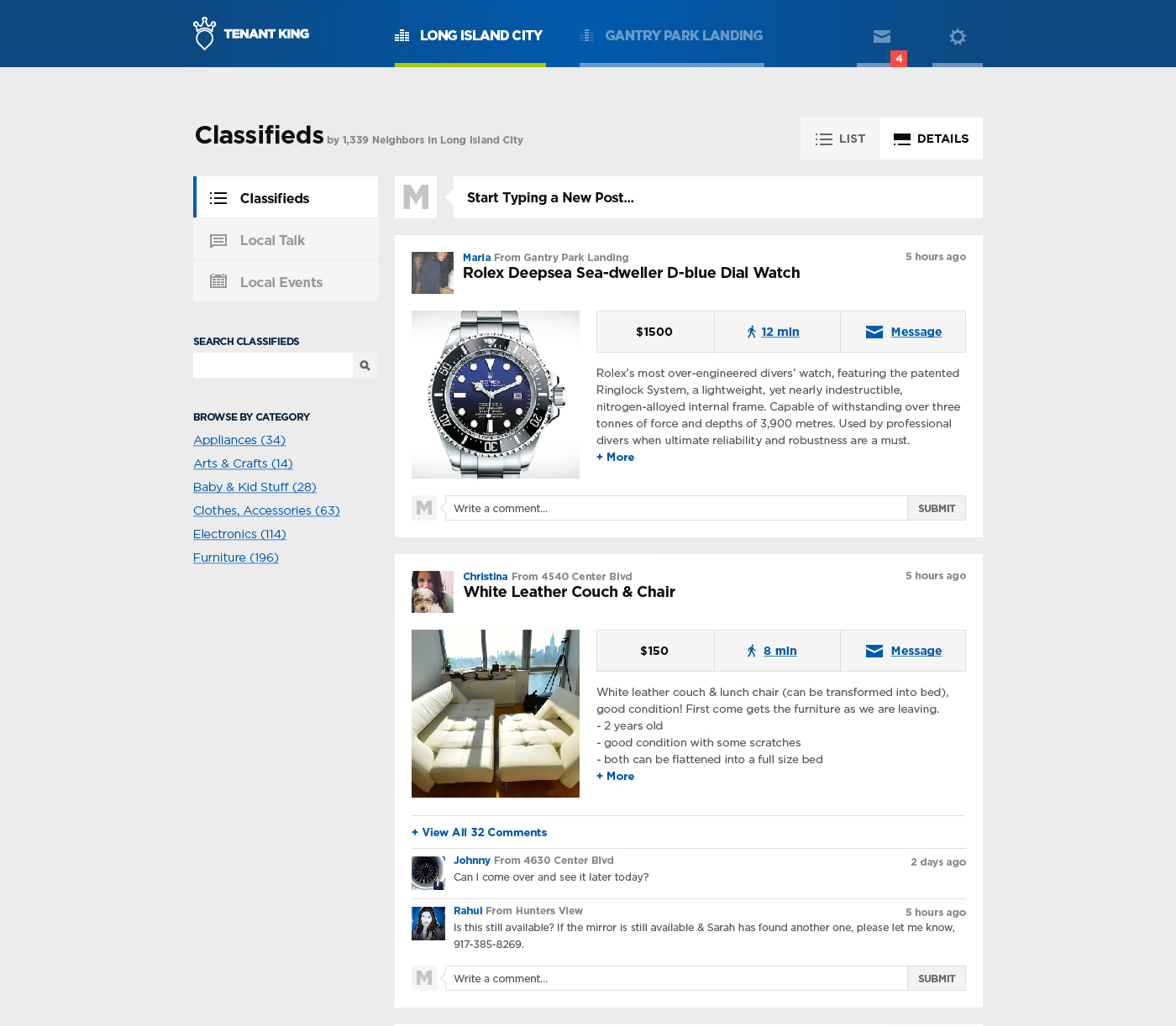 Our traction is remarkable in Long Island City (where we launched our MVP), where see around 100 hyperlocal classifieds added on a weekly basis. Classifieds about furniture, electronics, and move-out sales are also picking up in all other neighborhoods we cover. A growing use case is people seeking or offering apartments for short time rent, especially around holidays where there is an increased demand and a supply to match it. With AirBnb you have to trust complete strangers who are gone before you come back. However, with Tenant King it is family and relatives of neighbors in your building, who feel the responsibility and can be held accountable. They can also handle the process of checking-in and checking-out, so you don’t need an extra person to take care of that.