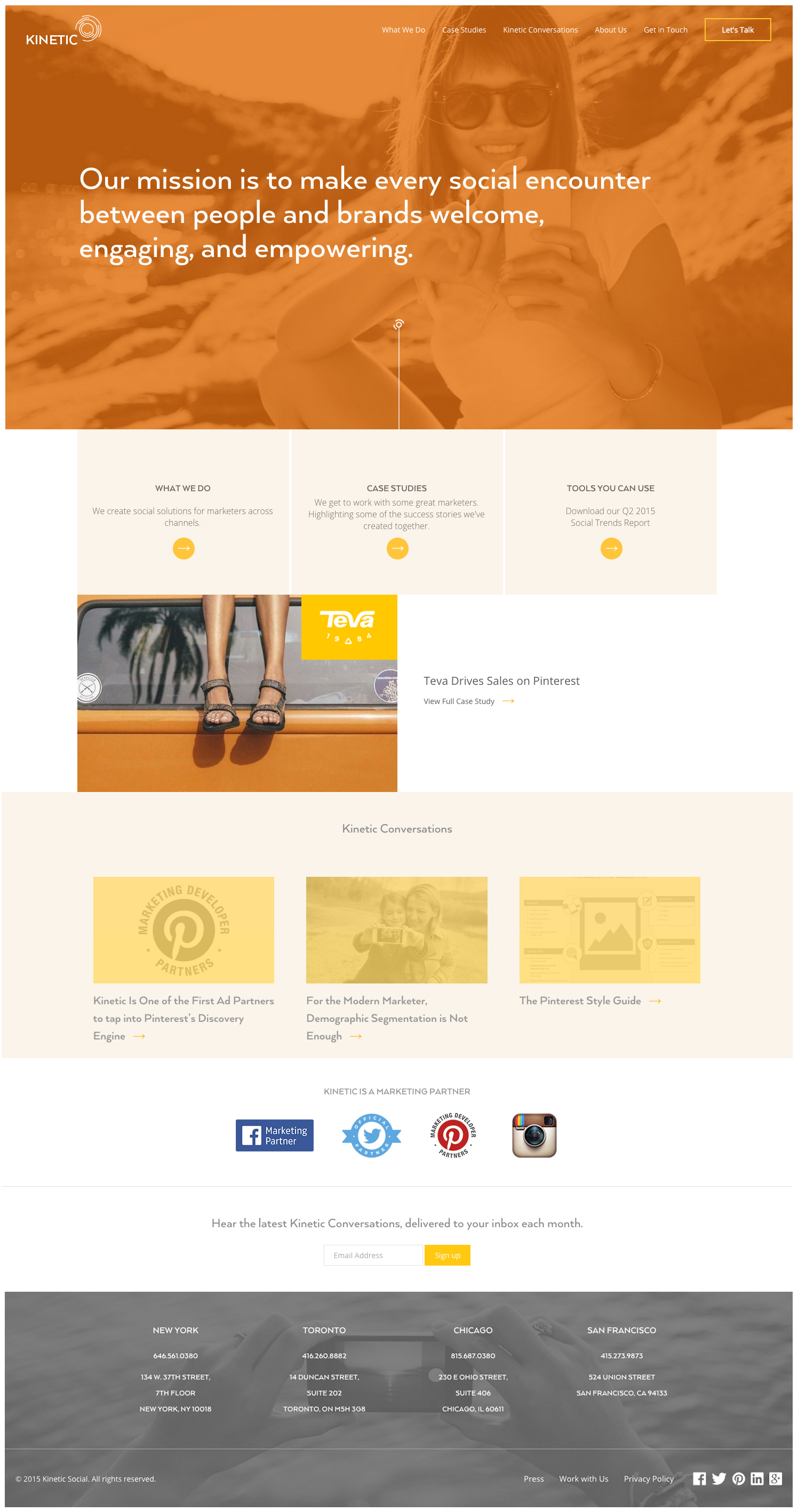 A leading social marketing platform, Kinetic helps brands deliver quality encounters that delight consumers, build brand value and drive sales. Through our strategic partnership, campaign management and SaaS offerings, we design and manage campaigns across social, display and the mobile open web. Our powerful, intuitive technology reflects how the modern marketer thinks and works. We combine that proactive innovation with strategic thinking at every step. Kinetic is a Facebook Marketing Partner, Twitter Official Partner, Pinterest Ads API Partner and Instagram API partner.