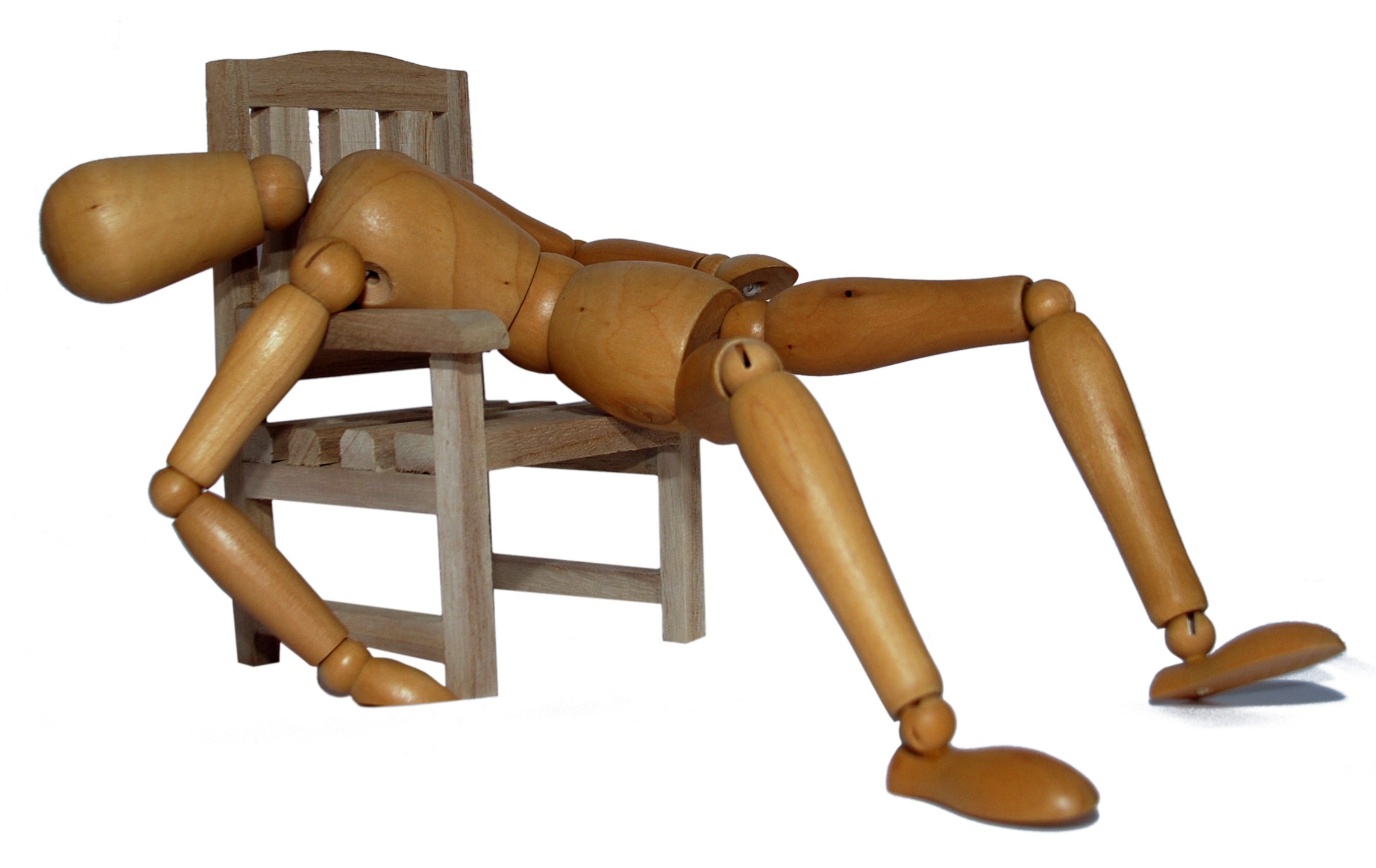Hanging on the edge of the chair, suffering from a sickness Relaxing peacefully in a wooden chair