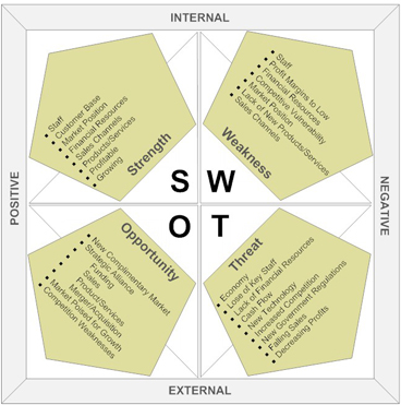 A SWOT analysis critically evaluates your company’s Strengths, Weaknesses, Opportunities and Threats. Strengths can be in your staff, customer base, market position, financial resources, sales channels, products, profitability, growth, etc. Weaknesses can be in your staff, market position, margins, financial resources, competitive vulnerability, missing products, customer complaints, missing sales channels, etc. Opportunities can be to enter complimentary markets, form alliances, raise funds, launch new products, pursue M&A activity, exploit customer weaknesses, etc. Finally, threats can be around the economy, losing key staff, lack of financial resources, limited cash flow, disintermediation, falling prices, etc. Think about this as an “internal” evaluation of your business.
