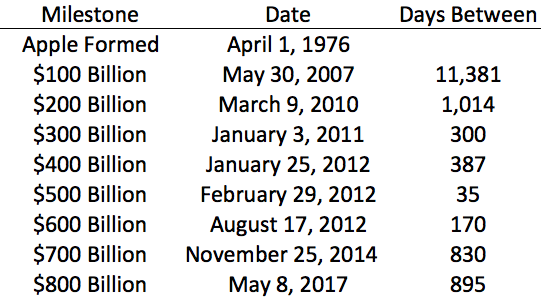 Not including the first 11,381 days it took Apple to go from $0 to $100 billion in value, Apple has added $100 billion in market cap, on average, every 519 days.