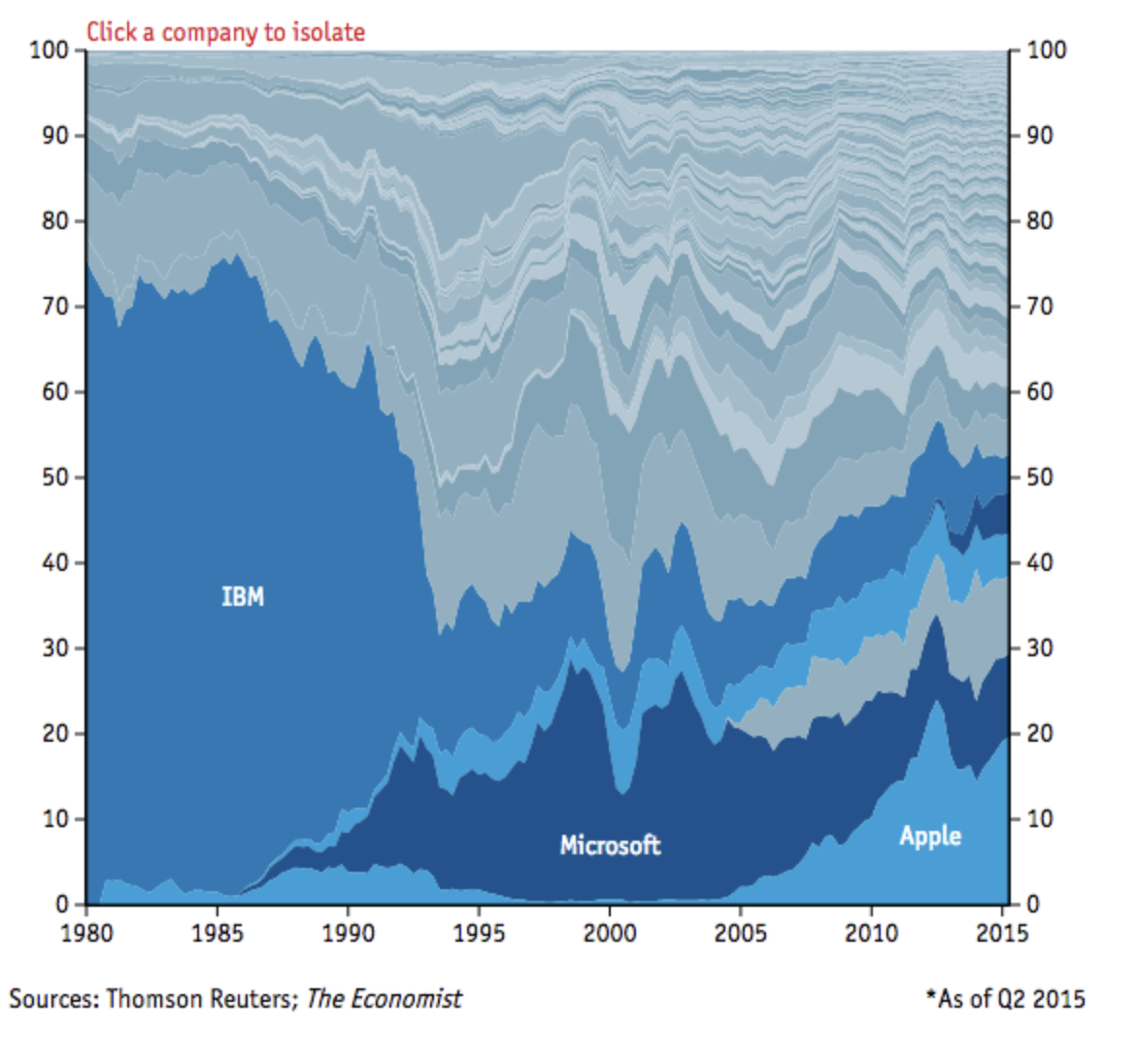 The graphic shows that IBM’s dominance of the mainframe world enabled it to control 75% market share of the total market cap of the top 100 tech firms in 1980. As the world migrated to desktop, IBMs dominance waned, and Microsoft dominated with a 30% market share. As we moved to mobile, Apple peaked at about 25% share of total market cap. So it turns out, that in tech, like most everything else, nothing is constant but change.
