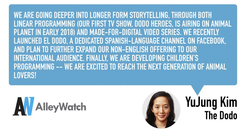 We are going deeper into longer form storytelling, through both linear programming (our first TV show, Dodo Heroes, is airing on Animal Planet in early 2018) and made-for-digital video series. We recently launched El Dodo, a dedicated Spanish-language channel on Facebook, and plan to further expand our non-English offering to our international audience. Finally, we are developing children’s programming — we are excited to reach the next generation of animal lovers!