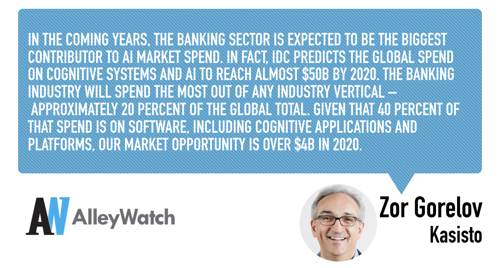 In the coming years, the banking sector is expected to be the biggest contributor to AI market spend. In fact, IDC predicts the global spend on cognitive systems and AI to reach almost $50B by 2020. The banking industry will spend the most out of any industry vertical – approximately 20 percent of the global total. Given that 40 percent of that spend is on software, including cognitive applications and platforms, our market opportunity is over $4B in 2020.