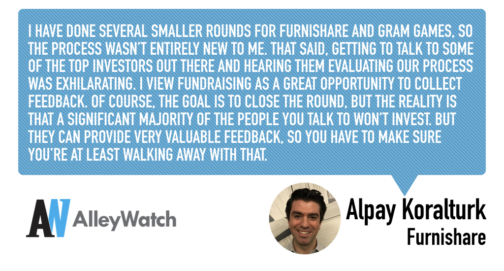 I have done several smaller rounds for Furnishare and Gram Games, so the process wasn’t entirely new to me. That said, getting to talk to some of the top investors out there and hearing them evaluating our process was exhilarating. I view fundraising as a great opportunity to collect feedback. Of course, the goal is to close the round, but the reality is that a significant majority of the people you talk to won’t invest. But they can provide very valuable feedback, so you have to make sure you’re at least walking away with that.
