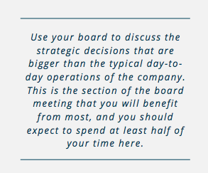 - Use your board to discuss the strategic decisions that are bigger than the typical day-to-day operations of the company. This can be considered the “meaty topic” of a board meeting.