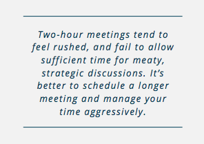 - As a rule, we find that 2-hour meetings tend to feel rushed, and fail to allow sufficient time for the meaty, strategic discussions that should form the basis of your board meetings.