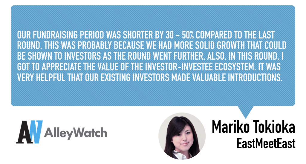 Our fundraising period was shorter by 30 – 50% compared to the last round. This was probably because we had more solid growth that could be shown to investors as the round went further. Also, in this round, I got to appreciate the value of the investor-investee ecosystem. It was very helpful that our existing investors made valuable introductions.