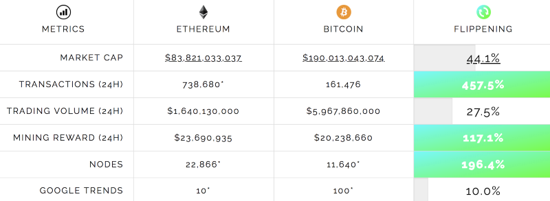 In Cryptoland, “The Flippening” refers to a point in time at which Ethereum overtakes Bitcoin in terms of market capitalization. There are websites dedicated to the “Flippening Watch”:
