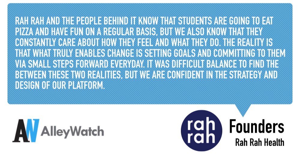 Before Rah Rah, my cofounder and I were working at a large consulting firm. During that time we received a firm-wide email notifying us that we had been enrolled in a corporate wellness platform. This firm has well over 100K employees and I realized that one of the main reasons the firm was paying for this service was because the happier and healthier employees are, the higher performing they would be and the more likely we are to stay at the company. While Rah Rah is very different than any corporate wellness platform…that same formula can be applied to the relationship between students and their respective universities. From there we started absorbing as much information as we could and realized that there was a market being underserved when it came to technology and the well-being of students.