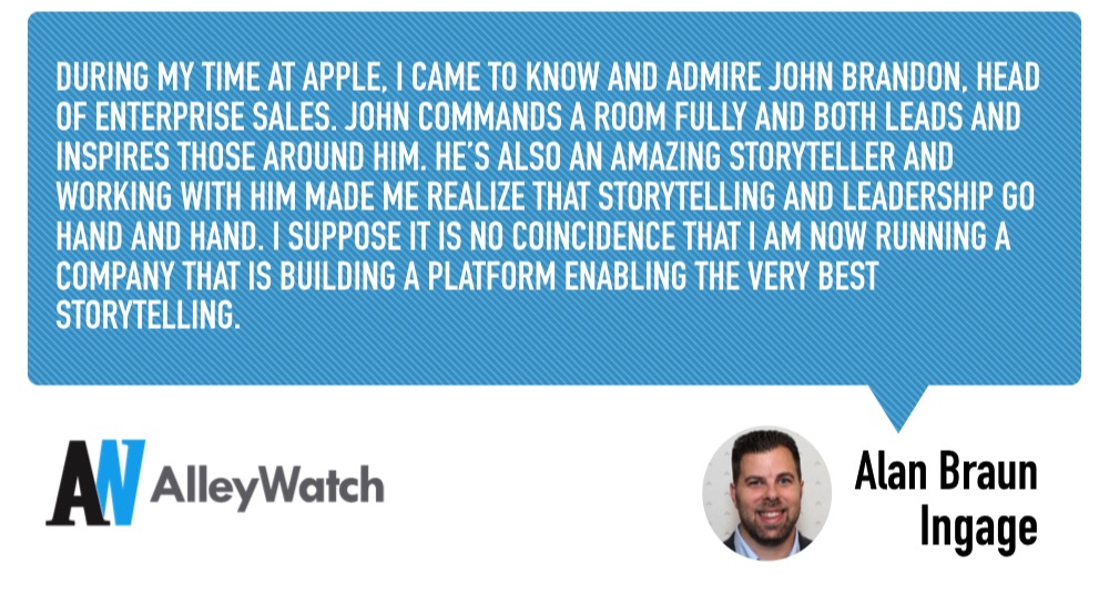 During my time at Apple, I came to know and admire John Brandon, Head of Enterprise Sales. John commands a room fully and both leads and inspires those around him. He’s also an amazing storyteller and working with him made me realize that storytelling and leadership go hand and hand. I suppose it is no coincidence that I am now running a company that is building a platform enabling the very best storytelling.