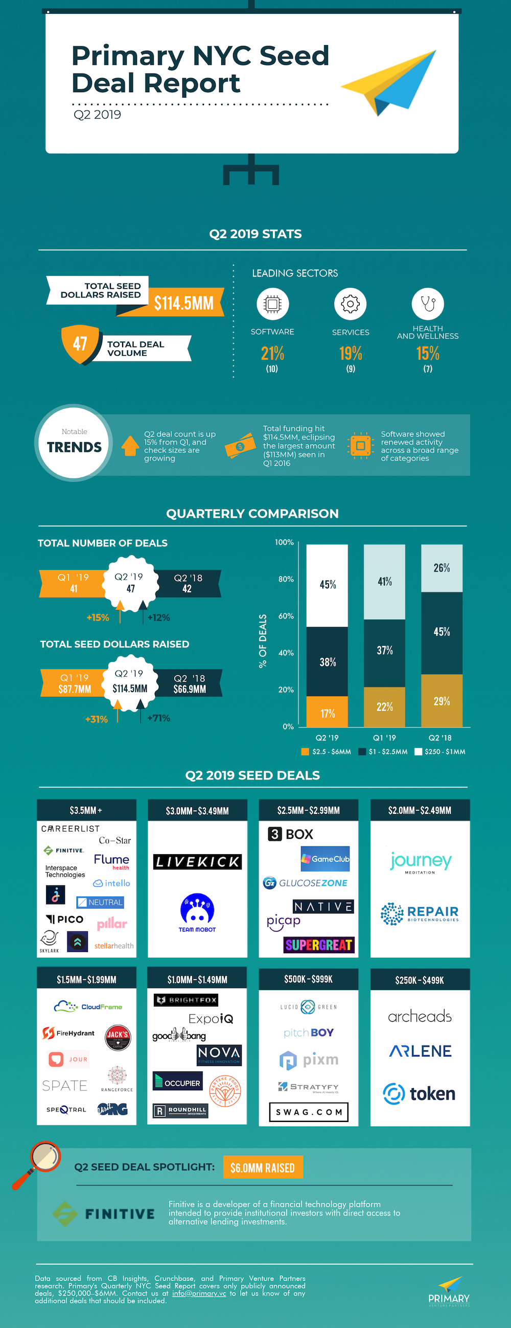 As we continue to live in a market flush with capital, investors are looking for fresh ways to earn returns. It’s no surprise then that the two largest seed deals in NYC for Q2 were marketplaces related to lending. Finitive, a marketplace that connects originators and institutional investors for alternative lending, raised $6M, while Pillar, a student loan management platform, raised $5.5M.