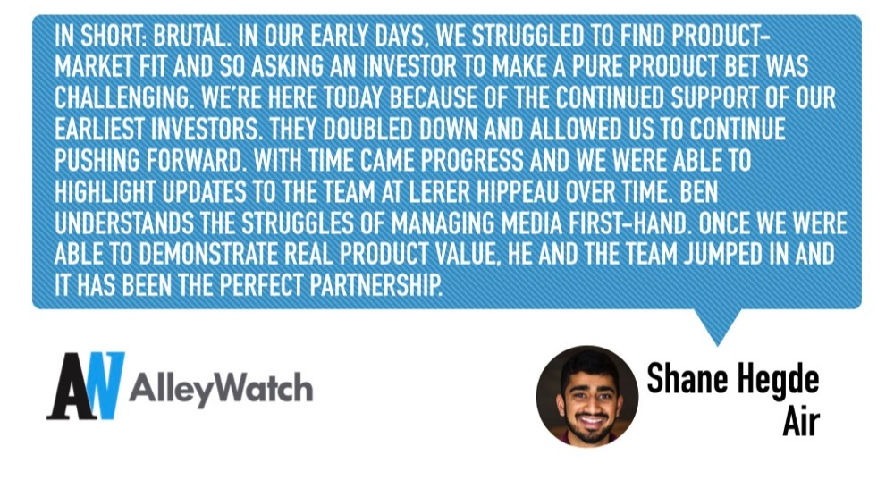 In short: brutal. In our early days, we struggled to find product-market fit and so asking an investor to make a pure product bet was challenging. We’re here today because of the continued support of our earliest investors. They doubled down and allowed us to continue pushing forward. With time came progress and we were able to highlight updates to the team at Lerer Hippeau over time. Ben understands the struggles of managing media first-hand. Once we were able to demonstrate real product value, he and the team jumped in and it has been the perfect partnership.