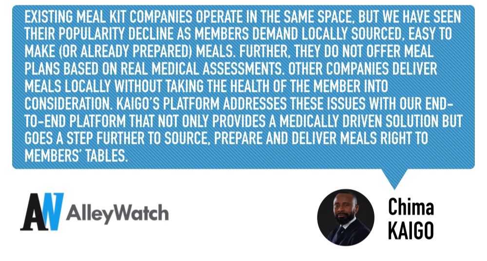KAIGO is the only nutrition platform to offer a medically driven end-to-end nutrition solution. Many companies provide meal plans and recommendations, but KAIGO’s goal is to make sure that individualized, physician and dietician plans are sourced, prepared and delivered right to your table. With our recent funding round, we plan to provide a wider range of meal options and offer meal delivery to more cities throughout the country.