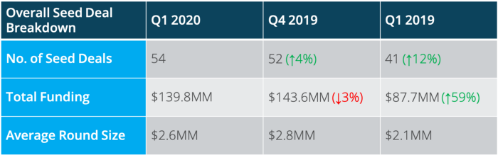 The number of seed deals dropped 30% from Q3 to Q4 2019, but that trend did not continue this quarter, with seed deals increasing slightly. This is not taking into account the likelihood of some companies staying under the radar with fundraising news as we navigate this difficult period.