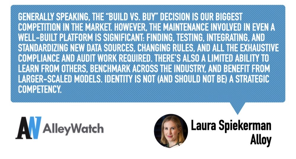 Generally speaking, the “build vs. buy” decision is our biggest competition in the market. However, the maintenance involved in even a well-built platform is significant: finding, testing, integrating, and standardizing new data sources, changing rules, and all the exhaustive compliance and audit work required. There’s also a limited ability to learn from others, benchmark across the industry, and benefit from larger-scaled models. Identity is not (and should not be) a strategic competency. Companies have systematically limited resources, which makes focusing on building a great product difficult. In-house builds rely on hard-coded data ingestion and decision logic that is hard to understand or change. They also lack the back-office automation/workflow efficiencies like auditable decision trail, reporting, and analytics.