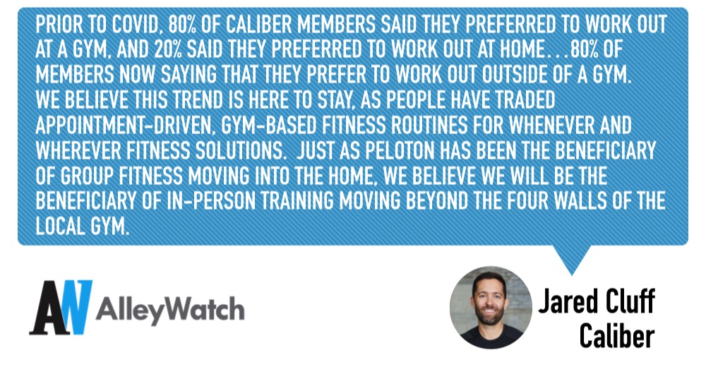Prior to COVID, 80% of Caliber members said they preferred to work out at a gym, and 20% said they preferred to work out at home.  As of March of this year, these numbers flipped, with 80% of members now saying that they prefer to work out outside of a gym.