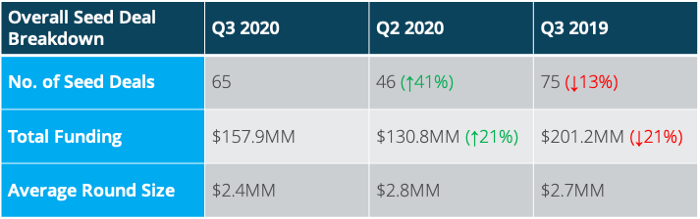 With a sizeable 41% increase in deals and a modest 21% increase in dollars, average round sizes have fallen 14%. This is the lowest average seed round size since Q2 2019. While large seed rounds are still happening, this quarter there was an equal number of rounds in the $1–2.49M range as the $2.5–$6M range.