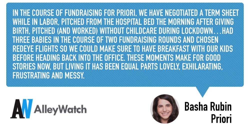 In the course of fundraising for Priori, we have negotiated a term sheet while in labor, pitched from the hospital bed the morning after giving birth, pitched (and worked) without childcare during lockdown, pumped breastmilk in the bathroom of a prominent VC firm in the 10 minutes before a pitch, had three babies in the course of two fundraising rounds and chosen redeye flights so we could make sure to have breakfast with our kids before heading back into the office. These moments make for good stories now, but living it has been equal parts lovely, exhilarating, frustrating, and messy.